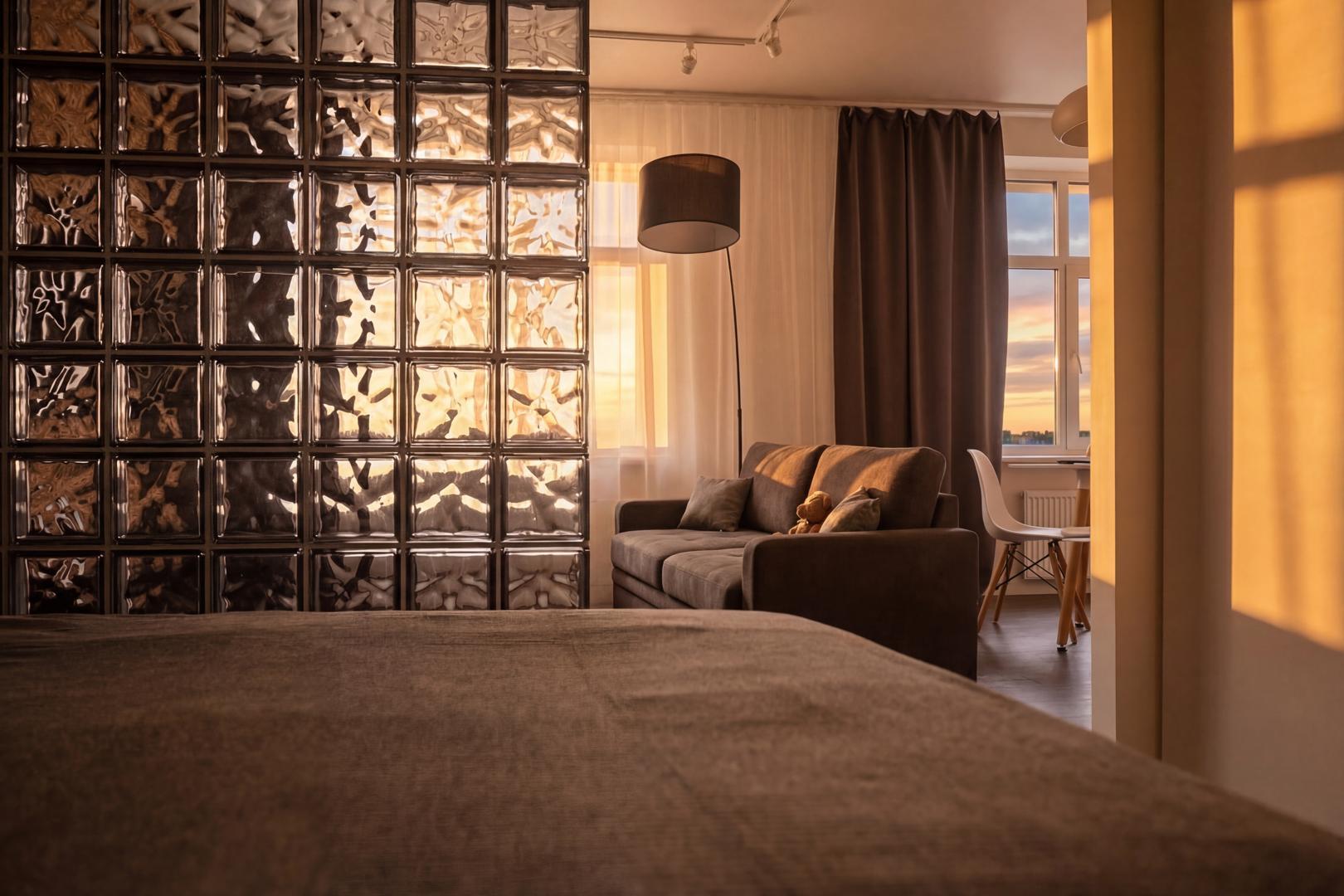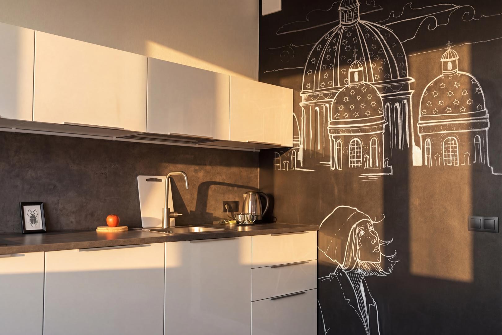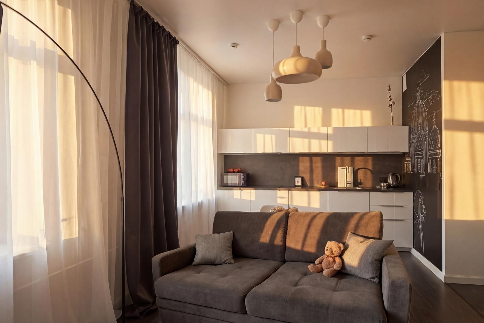 Зона спальни с двуспальной кроватью Queen size обеспечит вам комфортный сон. А на диване в гостиной могут расположится еще двое гостей. Шторы блэкаут помогут вам уснуть даже во время белых ночей. Просторная кухня оснащена всей необходимой техникой и посудой для приготовления еды, включая микроволновку, плиту и капсульную кофемашину.